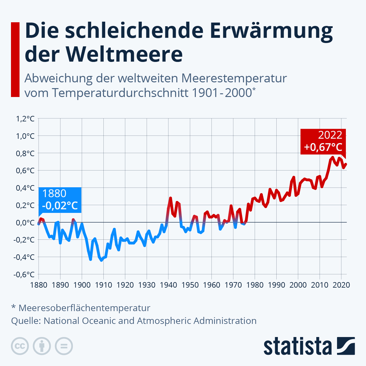 Wir hatten es in früheren Artikel bereits erwähnt: Dass der Klimawandel nicht noch härter zuschlägt, liegt auch daran, dass die Weltmeere sich nicht so schnell erwärmen wie die Landmassen, und die Meere machen immerhin 70 Prozent der Erdoberfläche aus. Aber auch in den Ozeanen steigen die Temperaturen, wie die folgende Statista-Grafik ausweist: