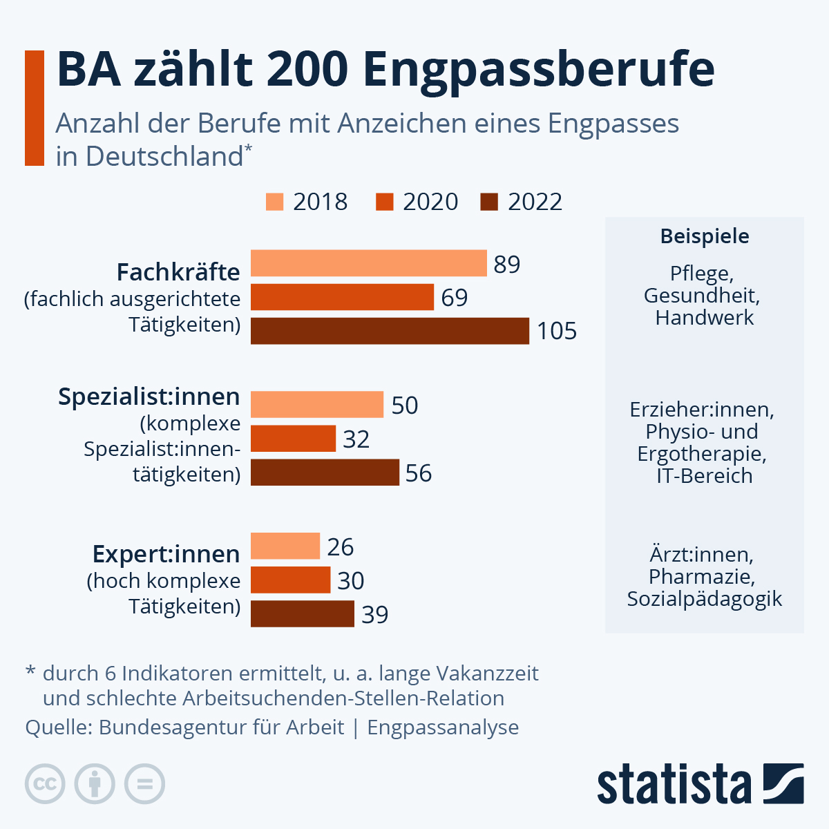 Bei der letzten Engpassanalyse hat die Bundesagentur für Arbeit (BA) 200 Berufe mit Anzeichen eines Engpasses in Deutschland gezählt – das sind deutlich mehr als 2021. Die BA „bewertet einmal jährlich die Fachkräftesituation am Arbeitsmarkt. Anhand von 6 statistischen Indikatoren (u.a. Vakanzzeit, Arbeitsuchenden-Stellen-Relation) wird dabei für alle Berufsgattungen […], soweit belastbare Daten vorliegen, ein Punktewert ermittelt. Ist dieser größer gleich 2,0 handelt es sich um einen Engpassberuf.“