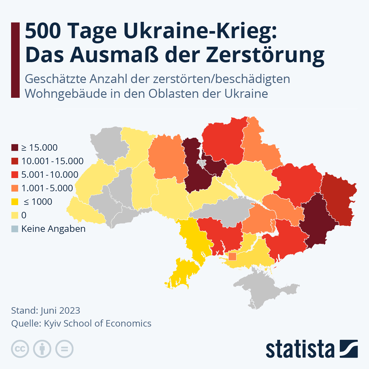 500 Tage dauerte vorgestern der Krieg in der Ukraine also, die Schäden hat Statista in einer Grafik dargestellt, soweit sie Wohngebäude betreffen. Die Schäden an der gesamten Infrastruktur sind noch deutlich höher.