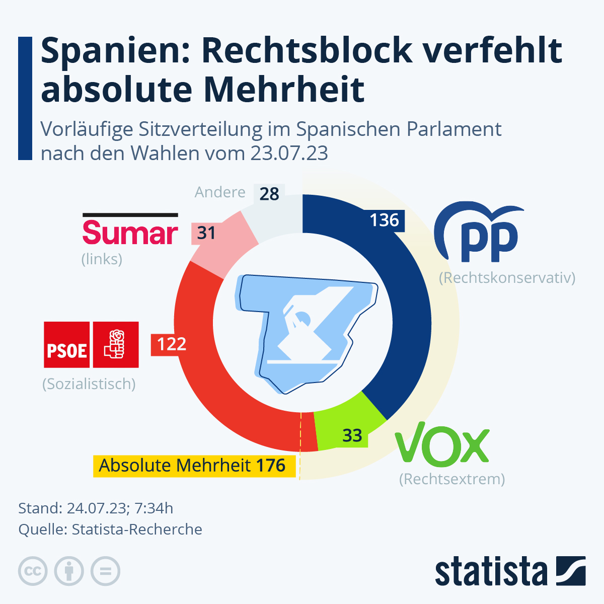 Die konservative Volkspartei (PP) von Herausforderer Alberto Nuñez Feijoo ist bei der Parlamentswahl in Spanien klar stärkste Kraft geworden. Dahinter folgt die sozialistischen PSOE von Ministerpräsident Pedro Sanchez. Die PP erreicht aber auch zusammen mit der als möglichem Partner gehandelten rechtspopulistischen Partei Vox keine Mehrheit im Parlament, wie die Statista-Grafik zeigt.