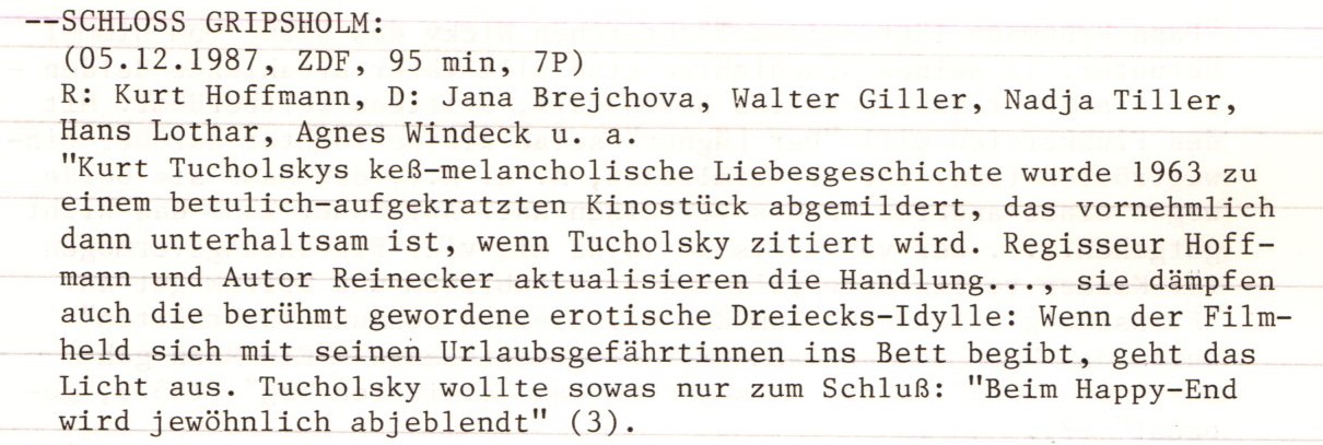 7/10 hatten wir damals vergeben, mit der für deutsche Filme dieser Zeit und allgemein wie immer sehr kleinen Kohorte von 79 Personen (Stand Juli 2023) kommt es in der IMDb zu durchschnittlich 6,6/10. Aber irgendwie wird es wohl doch ein Film von Kurt Hoffmann gewesen sein, obwohl dieser in den 1960ern nachließ, wie das gesamte deutsche Kino noch mehr an Kraft verlor als das Vorbild des klassischen Hollywoodfilms. Es war ja auch zuvor weniger davon da. Ich meine, ich hätte den Film später noch einmal gesehen. Falls ja und es geschah ab den 2010ern, wird es zu einer Erweiterung der obigen Rezension kommen. Bisher ein einmaliger Fall: Dass wir im Rahmen eines Zitats eine Rezension schon 1989 erwähnt haben, die auch in der Wikipedia zu finden ist.