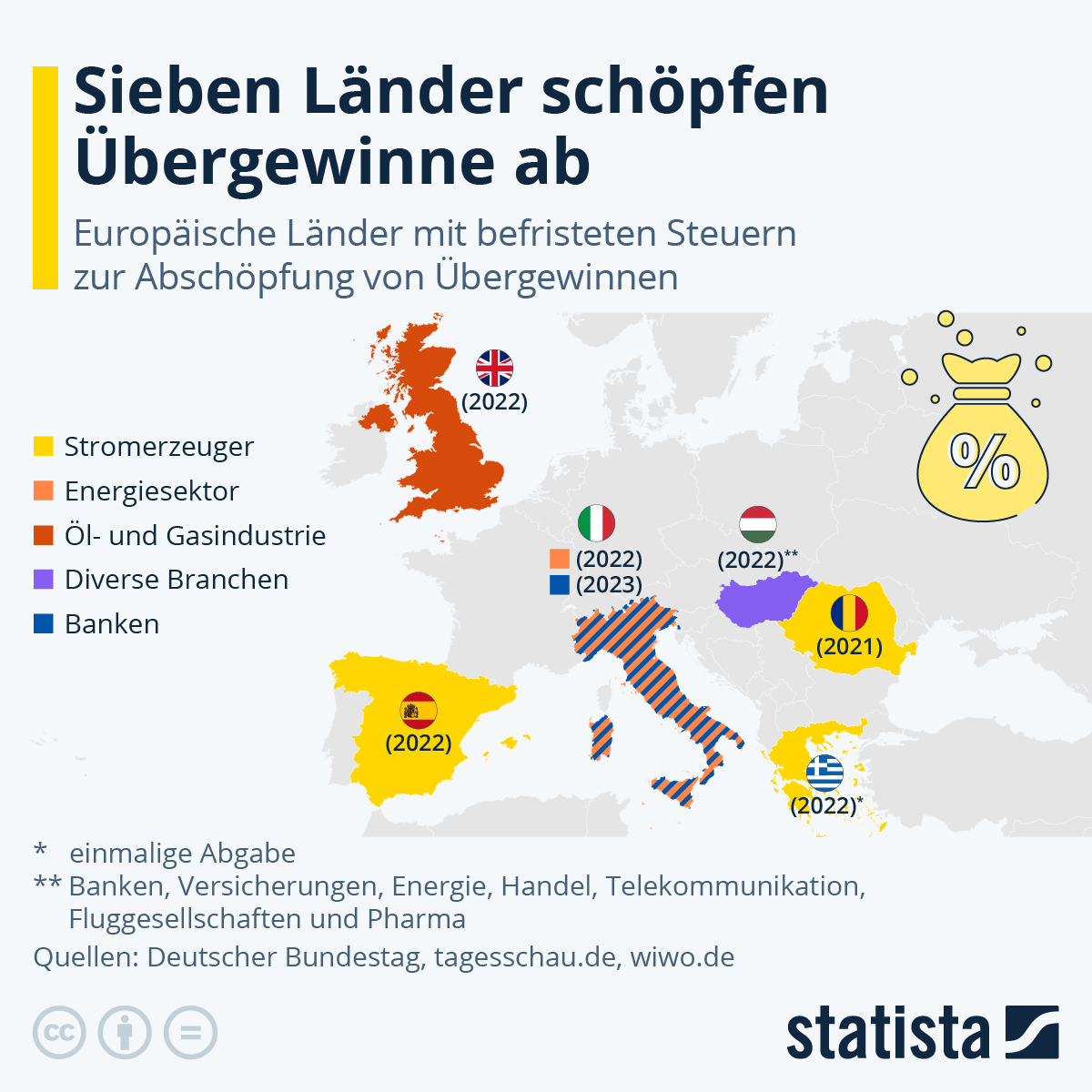 Sieben Länder in Europa haben bislang Steuern zur Abschöpfung von Übergewinnen eingeführt. Als erstes Land hatte Rumänien bereits 2021 eine Sondersteuer für Stromerzeuger eingeführt. Auch in den anderen Ländern trifft es überwiegend Unternehmen aus dem Energiesektor, wie die Statista-Grafik zeigt.