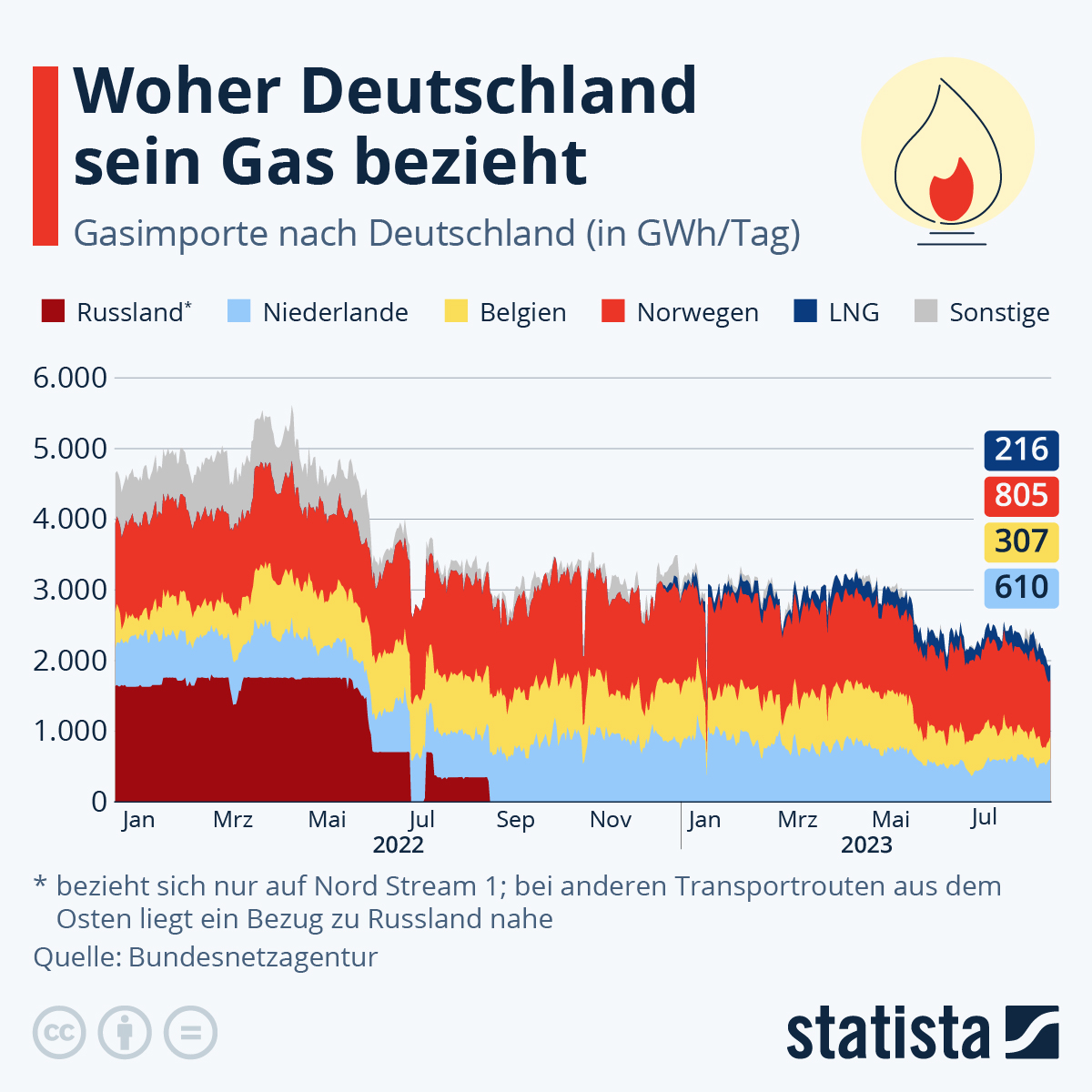 Die in den Daten der Bundesnetzagentur erfassten Importmengen beinhalten auch mögliche Ringflüsse. So werden grenzüberschreitende Gasflüsse bezeichnet, die Deutschland an einem Grenzübergangspunkt verlassen und an anderer Stelle wieder nach Deutschland zurückgeleitet werden. Die Darstellung der russischen Importe in der Grafik bezieht sich ausschließlich auf die Gasflüsse über die Nord Stream 1, da nur in diesem Falle ein unmittelbarer Bezug nach Russland hergestellt werden kann. Bei anderen Transportrouten aus dem Osten liegt häufig ebenfalls ein wesentlicher Bezug aus Russland nahe, es können jedoch auch Gasmengen aus dem übrigen Europäischen Fernleitungsnetz hinzukommen.