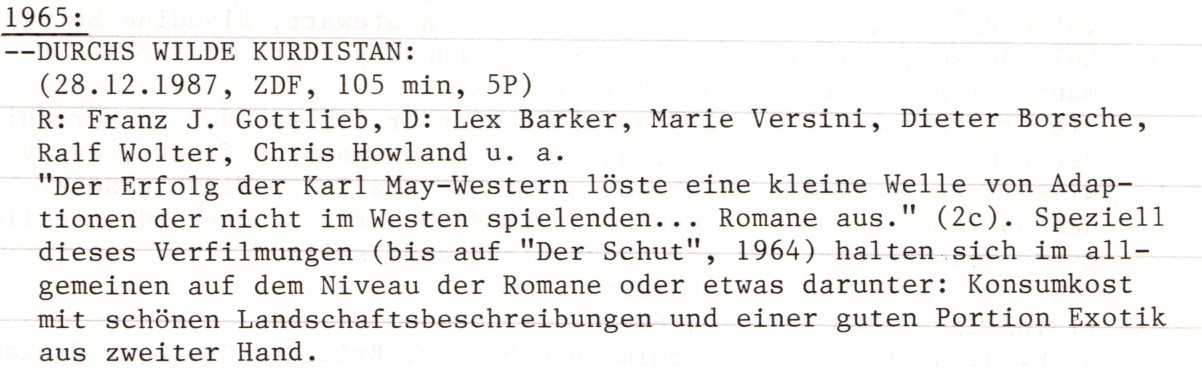 Ach ja, wie lange ist es her, dass wir all diese Karl-May-Bücher gelesen haben? Sicher noch länger als das Anschauen dieses Films. Damit unser Leser:innen aber nicht nur auf die kurze Rezension angewiesen sind, die wir während der Entstehung unseres Interesses für das Medium noch auf Schreibmaschine verfasst haben, haben wir die Wikipedia wieder ein wenig geplündert, getreu dem Motto „Wie du mir, so ich dir“, weil sie immer mehr nicht nur Kritiken zitiert, sondern sie zu kleinen Abhandlungen zusammenfasst, die möglichst mehr über einen Film aussagen sollen, als Texte einzelner Personen es können.