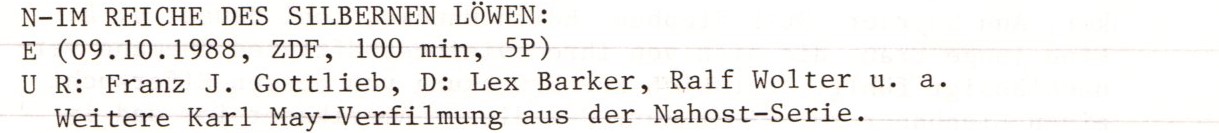 Erstaunlich, wie kurz wir uns damals fassen konnten, als diese quasi historische Rezension geschrieben wurde. Nun, man muss sie zusammen mit den übrigen zu den Karl-May-Orient-Verfilmungen lesen, die wir damals beschrieben haben, denn sie stand mit ihnen auf derselben Seite des mit Maschine geschriebenen Rezensionshefts, deswegen hier die Links zu den beiden übrigen Filmen „Der Schut“ und „Durchs wilde Kurdistan„.
