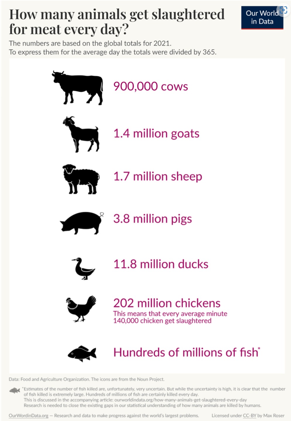 Max Roser (2023) – „How many animals get slaughtered every day?“. Published online at OurWorldInData.org. Retrieved from: ‚https://ourworldindata.org/how-many-animals-get-slaughtered-every-day‘ [Online Resource]
