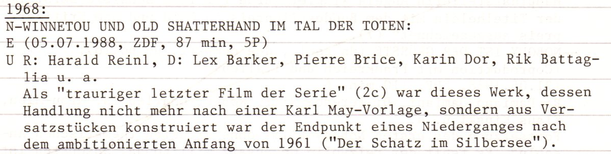 Unser Urteil war jedenfalls um mehr als einen Punkt schlechter als das der IMDb-Nutzer:innen heute (6,1/10). Wer recht hat, werden wir nicht mehr klären können, denn auf der Liste der Filme, die wir in den nächsten Jahren unbedingt anschauen wollen, steht die Wiederholung eines Karl-May-Streifens aus den 1960ern nicht. Auch unsere Wertung belegt, dass wir den Film wohl nicht für den besten der Reihe gehalten haben. Weitere Western nach Karl May sind im FVZ Nr. 8 aus dem Jahr 1989, der Vorlage für die aktuelle erste Deutschland-Chronologie, nicht enthalten, aber 6 oder 7 Punkte wären für die Spitzenfilme der Reihe wohl drin gewesen.