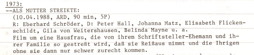 Johanna Matz hat sich aber nicht umgebracht, wegen des schlechten Films, sie lebt noch heute. Die Durchschnittsbewertung der IMDb-Nutzer:innen liegt mit 4,7/10 sogar 0,3 unter der unseren aus dem Jahr 1989. Ich hatte nicht in Erinnerung, dass dieser Film nach einer Vorlage von Eric Malpass gedreht wurde. Dessen vermutlich größerer Bestseller „Morgens um sieben ist die Welt noch in Ordnung“ und seine Fortsetzung „Wenn süß das Mondlicht auf den Hügeln schläft“ kann ich zumindest titelweise noch auswendig wiedergeben. Meine Eltern hatten beide Bücher, ich hatte sie gelesen, die Verfilmung von „Morgens um sieben“ später angeschaut und rezensiert habe. Die Kritik wird in der „zweiten Deutschland-Chronologie“ auftauchen.