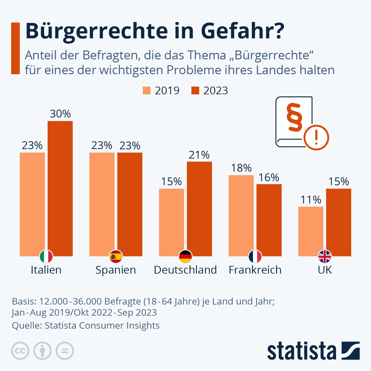 Waren 2019 rund 15 Prozent der Ansicht, dass das Thema „Bürgerrechte“ eines der wichtigsten Probleme des Landes ist, sind es mittlerweile über 20 Prozent der hiesigen Befragten der Statista Consumer Insights. Ähnlich stark ist die Sorge um die bürgerlichen Freiheiten in Italien gestiegen, wie der Blick auf die Statista-Grafik zeigt. Dagegen hat sich die Einschätzung der Spanier:innen bei diesem Thema nicht verändert.