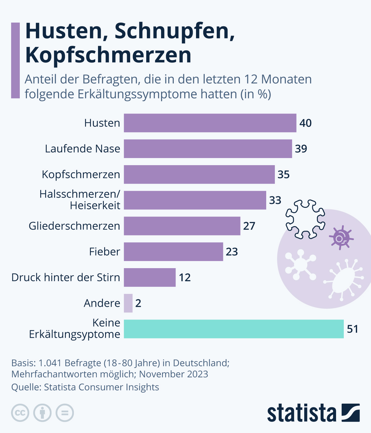 Allen Atemwegserkrankungen gemein sind Erkältungssymptome. Unsere Analyst:innen von den Statista Consumer Insights wollten wissen, welche Symptome am häufigsten vorkommen. Laut Angaben der etwas über 1.000 Befragten sind das Husten, Schnupfen und Kopfschmerzen. Ebenfalls weit verbreitet sind Halsschmerzen, Heiserkeit und Gliederschmerzen.