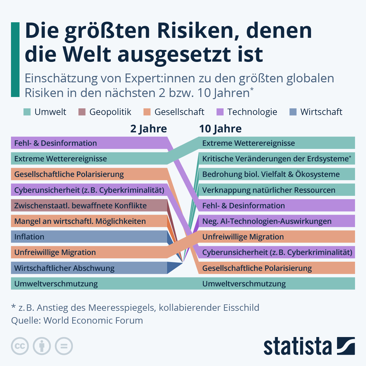 Kurzfristig sieht der Global Risks Report 2024 aber erstmal vor allem Fehl- und Desinformation als größtes Risiko. Das liegt auch daran, dass in den kommenden zwei Jahren fast drei Milliarden Menschen neue Regierungen wählen können. Außerdem finden sich mit gesellschaftlicher Spaltung, Cyberunsicherheit und bewaffneten Konflikten noch drei weitere Risiken in den Top 5, die nichts mit der Umwelt zu tun haben.