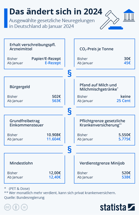 Liebe Leser:innen, der Jahreswechsel ist schon mehr als zwei Wochen her, aber heute hat Statista eine schnelle, grafische Übersicht über die wichtigsten Änderungen zum Jahresbeginn bereitgestellt, die wir hier kommentarlos weitergeben: