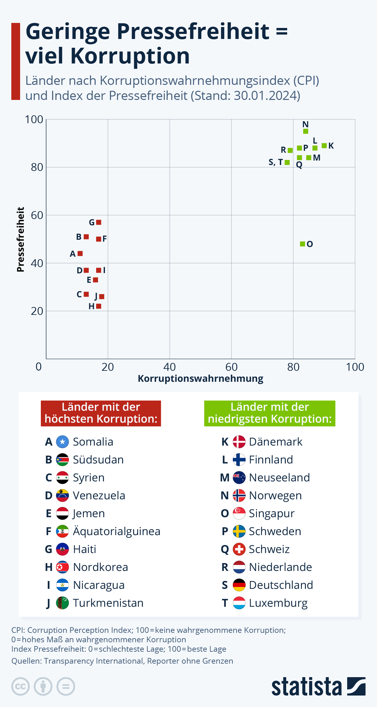 Staaten mit einer stark eingeschränkten Pressefreiheit haben mehrheitlich mit einem hohen Maß an Korruption zu kämpfen, wie die die Statista-Grafik zeigt. Die Länderpunkte im Diagramm sind dabei nach ihrem Abschneiden beim Korruptionswahrnehmungsindex für das Jahr 2023 (Corruption Perception Index, CPI) von Transparency International und dem Index der Pressefreiheit 2023 von Reporter ohne Grenzen sortiert. Ausgewählt wurden die 10 Staaten mit der höchsten Korruptionswahrnehmung und die 10 Staaten mit der niedrigsten Korruptionswahrnehmung. Das Ergebnis zeigt einen klaren Trend. So weisen die Länder Somalia und Südsudan etwa den weltweit schlechtesten Wert bei der wahrgenommenen Korruption auf: beide erreichen nur 11 bzw. 13 von 100 möglichen Indexpunkten. Niedrige Werte entsprechen hierbei einem hohen Maß an Korruption. Gleichzeitig schneiden beide Länder auf der weltweiten Rangliste der Pressefreiheit mit einem Indexwert von 44 (Somalia) bzw. 51 (Südsudan) von 100 möglichen Punkten relativ schlecht ab. Bei diesem Index ist ein hoher Wert gleichbedeutend mit einem hohen Maß an Pressefreiheit.