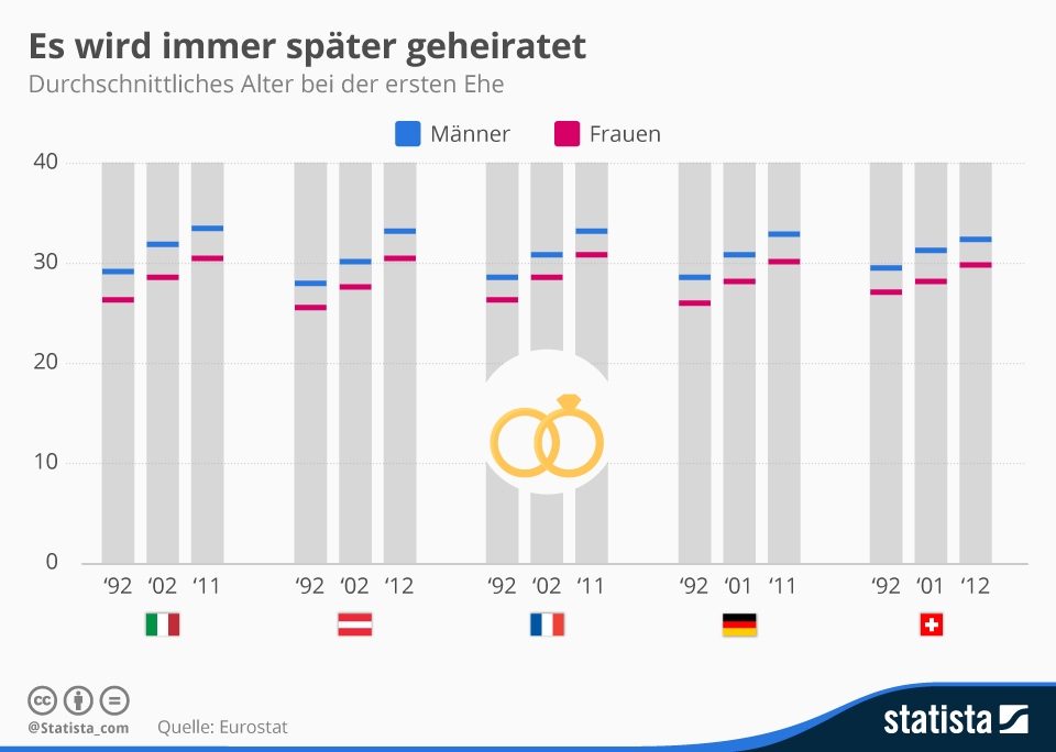 Schon im Jahr 2015 hat Statista eine Grafik erstellt, welche die Veränderungen beim Alter der Erstehe-Schließenden in den Jahren 1992 bis 2012 darstellt, sodass wir hier um ein weiteres Jahrzehnt zurückblicken können: