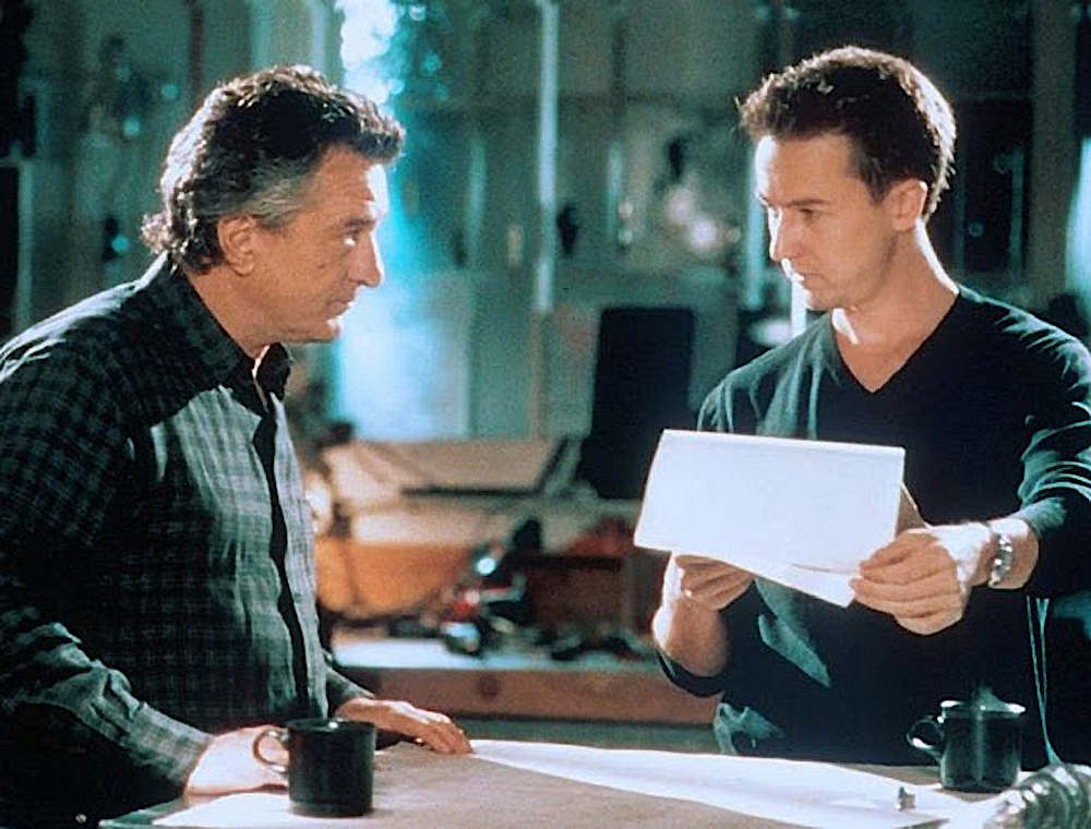 Im Fernsehen laufen derzeit viele De-Niro-Filme, daher wird mein Bild über seine Arbeiten kompletter, jenseits von Werken, in denen nicht nur seine Leistung, sondern alles, was sich mit ihnen verbindet, brillant ist, wie „The Deer Hunter“ (1978), „Wie ein wilder Stier“ (1980) oder einem meiner absoluten Lieblingsfilme, „Es war einmal in Amerika“ (1983). Je kompletter aber dieses Bild wird, desto mehr verstehe ich, warum de Niro sich, immer mit hohem persönlichem Einsatz und Perfektionsdrang, nicht immer so in Szene setzen kann wie in den genannten Meisterwerken. „The Score“ beispielsweise wird überschattet von Brandos Abschiedsvorstellung, auch wenn der Gigant der 1950er, der mit „Der Pate“ noch einmal groß auftrumpfte, de Niro nicht schauspielerisch dominiert. Und da gibt es noch „Nick“, flirrend gespielt von Edward Norton und nach dem Vorbild seiner Rolle eines Delinquenten, der auf psychisch erkrankt spielt und damit durchkommt, die er in seinem Debüt „Primal Fear“ innehatte. In „The Score“ fickt er nicht den arroganten Anwalt, wie in „Primal Fear“, der seinerzeit von Richard Gere gespielt wurde, sondern zieht den Kürzeren gegenüber dem sympathischen Einbruchskünstler Nick. Trotzdem hat er die interessantere Rolle, als Technikfreak des neuen Jahrtausends, der mit den hier vorhandenen Sicherungsmechanismen allerhand Schabernack treibt, denn ohne ihn käme Nick niemals an die komplex gesicherte Beute, ein französisches Zepter aus dem 17. Jahrhundert, heran.