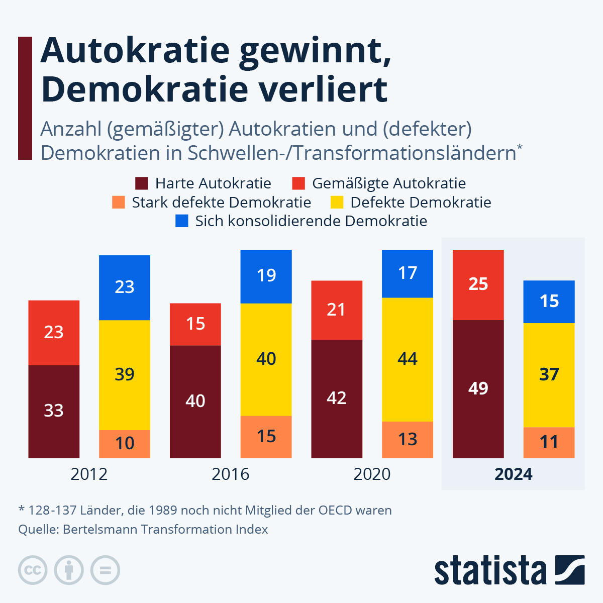 74 der 137 von der Bertelsmann Stiftung im Rahmen des Bertelsmann Transformation Index untersuchten Schwellen- oder Transformationsländern, die 1989 noch kein OECD-Mitglied waren, sind gemäßigte oder harte Autokratien. Diese Einschätzung ergibt sich aus einer Analyse von 18 Indikatoren in den Bereichen „freie Wahlen und politische Beteiligung“ sowie „Funktionsfähigkeit des Rechtsstaats und des Staats sowie die Akzeptanz, Repräsentativität und die politische Kultur des demokratischen Systems“. Erreicht ein Land einen Indexwert von vier von zehn Punkten oder weniger, gilt es als Autokratie. Damit zeigen erstmals in der Geschichte des Index mehr untersuchte Länder autokratische als demokratische Züge. Für diesen Wandel waren lediglich vier Jahre nötig, wie unsere Grafik zeigt.