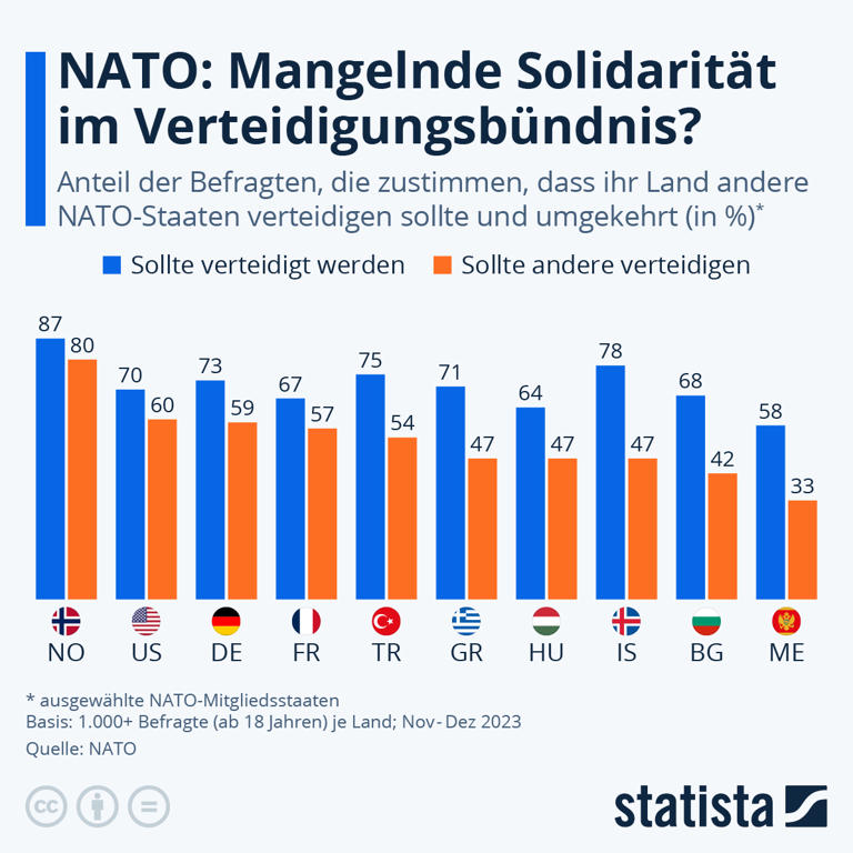Wie aus der jährlichen NATO-Umfrage hervorgeht, verlassen sich die meisten Länder in so einem Fall auf ihre Bündnispartner, zeigen jedoch deutlich weniger eigene Verteidigungsbereitschaft. Wie die Statista-Grafik anhand einer Auswahl von Mitgliedsstaaten zeigt, sind beispielsweise 73 Prozent der Befragten in Deutschland der Meinung, dass die Bundesrepublik im Angriffsfall von den Bündnispartnern verteidigt werden sollte. Dass Deutschland selbst sein Nötigstes tun sollte, um andere NATO-Staaten zu schützen denken hingegen nur etwa 59 Prozent.