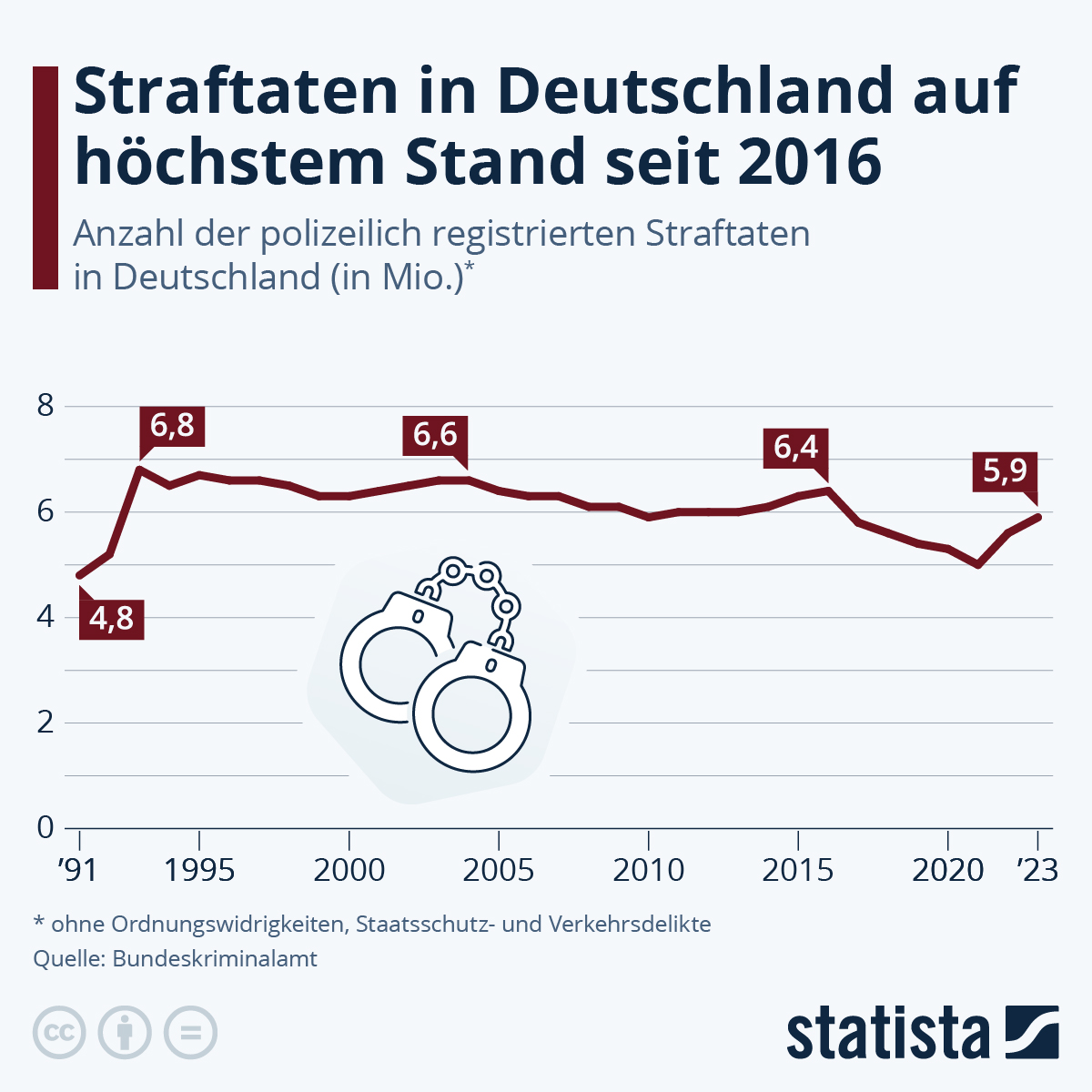 Die Anzahl der polizeilich registrierten Straftaten in Deutschland steigt. Laut Kriminalstatistik des Bundeskriminalamtes (BKA) haben die Behörden im vergangenen Jahr rund 5,9 Millionen Straftaten erfasst – so viele wie seit 2016 nicht mehr. Über sechs Millionen lagen die Fallzahlen bisher nur in den Jahren 1993 bis 2009 und von 2014 bis 2016, wie die Statista-Grafik zeigt.