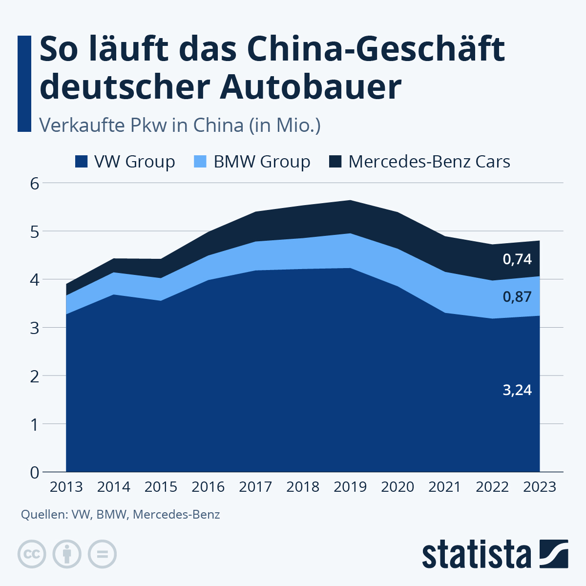BMW und Mercedes haben ihr China-Geschäft in den letzten Jahren kontinuierlich ausgebaut. Im Jahr 2013 lag die Zahl der in China verkauften Personenkraftwagen noch bei 0,4 (BMW) bzw. 0,2 Millionen (Mercedes). 2023 verkaufte BMW hingegen 0,8 Millionen Autos (+78 Prozent), Mercedes kommt auf 0,7 Millionen Fahrzeuge (+155 Prozent). Die Volkswagen Group liegt in absoluten Zahlen deutlich über den beiden Premium-Herstellern, hat über den genannten Zeitraum allerdings ein Minus von rund 12 Prozent zu verbuchen. Zu Beginn des laufenden Jahre erlebt Volkswagen in China allerdings wieder Auftrieb.