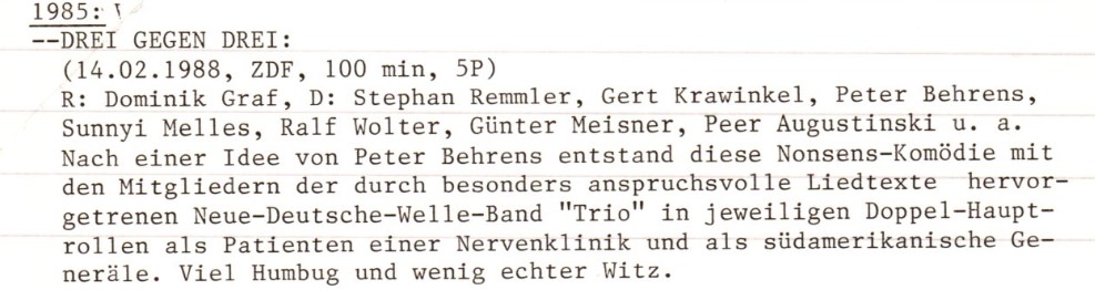 Auch die IMDb-Nutzer:innen vergeben im Schnitt nur 5,2/10, da liegen wir also mit unseren fünf Punkten aus dem Jahr 1989 im heutigen Trend. Dominik Graf wurde zwar nie Stanley Kubrick, aber aus Pannen wie diesem Film hat er gelernt und zählt heute zu den renommiertesten deutschen Regisseuren und greift auf erfahrene, gelernte Schauspieler:innen zurück. Abteilung Fernsehen, vor allem Krimi. Beim Kinofilm gibt es ja kaum noch deutsche Regisseure von Rang, wir sind sozusagen wieder in den 1960ern angekommen, bevor der Neue Deutsche Film erfunden wurde. Der hat übrigens nichts mit der Neuen Deutschen Welle zu tun. Oder nur sehr indirekt. Jedenfalls war Trios Hit »Da, da, da« geradezu der Inbegriff dieser immerhin originellen Musikrichtung, deren Genese recht interessant ist und es handelt sich nicht um einen NDF, sondern nur um die kinematografische Tätigkeit von Protagonisten der NDW. Für mich hat sie eine Bedeutung, weil ich genau im richtigen Alter war, als dieser kurze Hype der Jahre 1982 bis 1985 (Vorläufer ab ca. 1978) die Charts aufgemischt hat. Heute kaum denkbar, dass in Deutsch gesungene Lieder zu den populärsten der Saison rechnen.