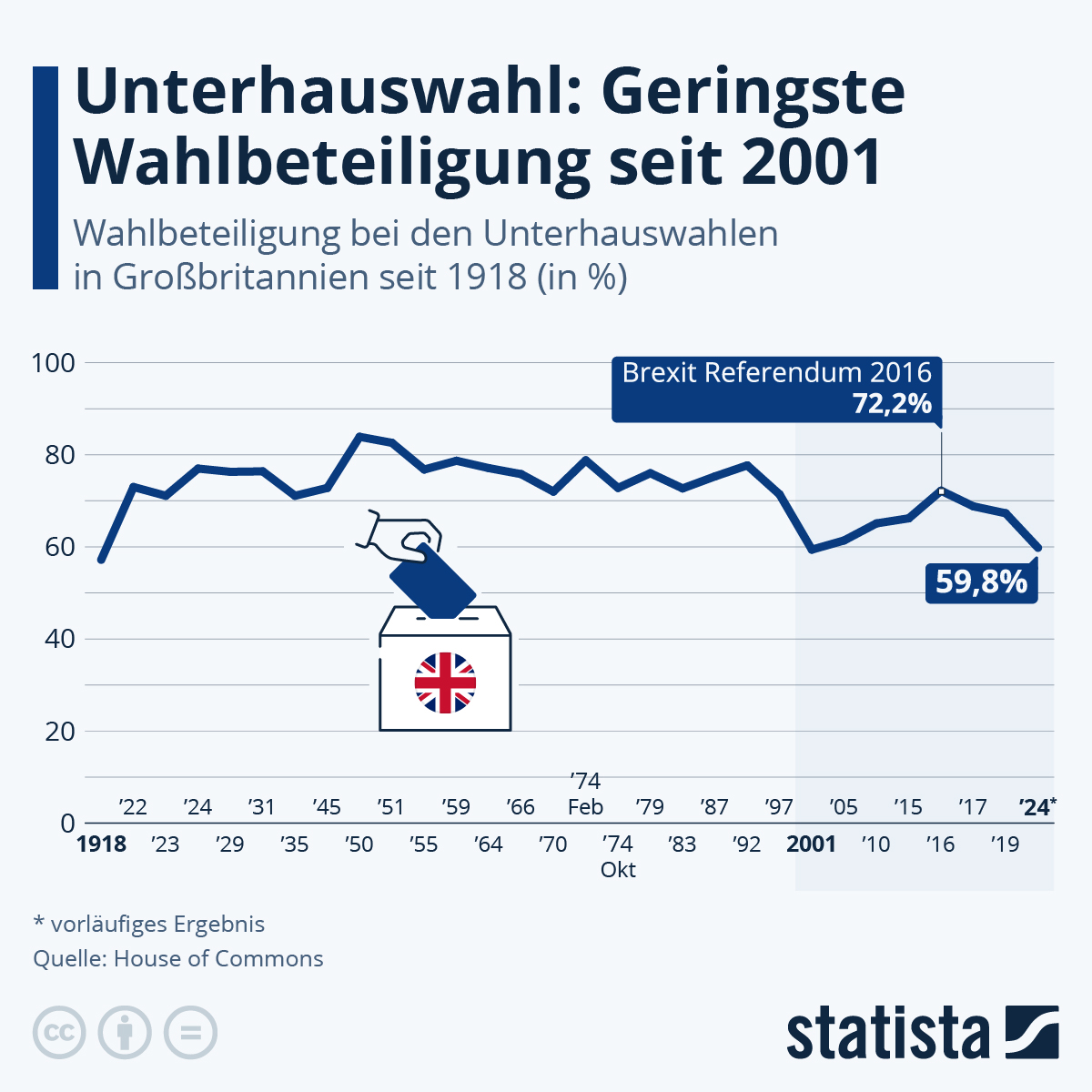 Wir erstellen heute noch ein kleines Update zur Parlamentswahl im Vereinigten Königreich (der Hauptartikel ist unten angehängt oder hier einzusehen). Statista hat die historische Wahlbeteiligung in einer Grafik gezeit, die ungewöhnliche weit zurückreicht – bis ins Jahr 1918: