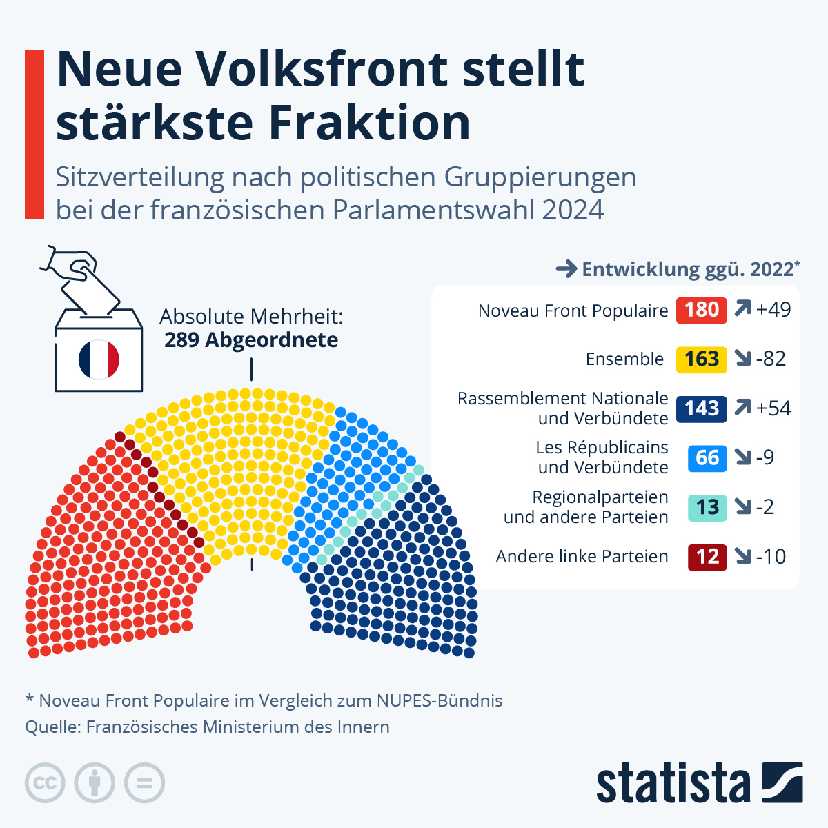 180 Sitze hat das kurz vor den Wahlen geschmiedete linke Bündnis Nouveau Front populaire (zu deutsch: Neue Volksfront) gewonnen. Damit hat der Zusammenschluss von Sozialisten, Kommunisten und Grünen überraschend die französische Parlamentswahl für sich entschieden. Ensemble pour la République, liegt an zweiter Stelle. Indes verlor das Wahlbündnis vorn Präsident Macron im Vergleich zur Wahl 2022 82 Mandate. Das Rassemblement Nationale (RN) und seine Verbündeten gilt dagegen als Verliere der Wahl.