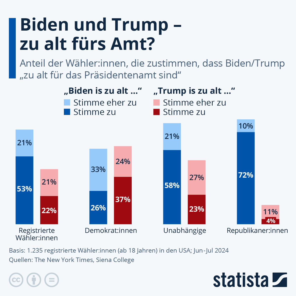 Ob die beiden Präsidentschaftsbewerber des Jahrs 2024 am Ende der Amtszeit bzw. am Ende der Amtszeit des anderen Bewerbers schon im Rollstuhl sitzen werden? Und was ist von einer Demokratie zu halten, die trotz unzähliger Talente ein Greisenrennen um die Präsidentschaft in einer Zeit abhält, in der es eminent wichtig ist, schnell und geistig auf der Höhe wichtige Entscheidungen treffen zu können? Finden die Amerikaner:innen aber Joe Biden und Donald Trump überhaupt zu alt? Dazu gibt es eine neue Statista-Grafik: