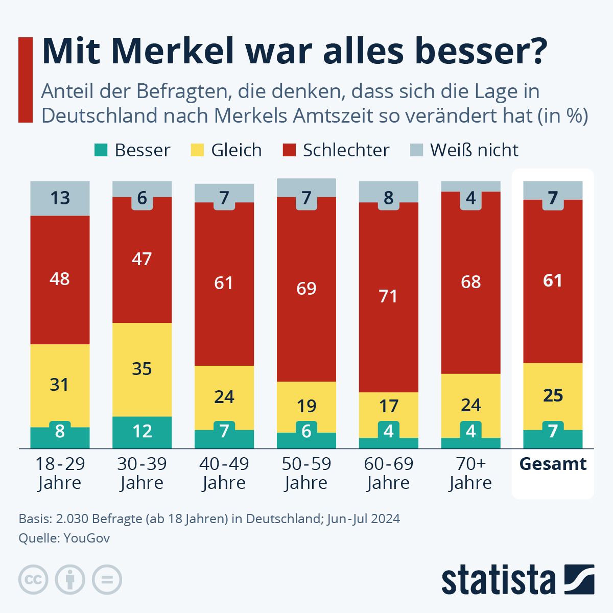 In der Umfrage, die im Ausgangsartikel besprochen wird, war trotzdem keine Mehrheit zu finden, die Angela Merkel vermisst. Die Befragungen stammen aus unterschiedlichen Quellen und unterscheiden sich bezüglich ihrer Methodik, aber wir extrahieren trotzdem eine Tendenz: Dass viele glauben, es sei seit Angela Merkels Abgang schlechter geworden, heißt nicht, dass sie sich die frühere Kanzlerin zurückwünschen. Was auch bedeutet: besser oder schlechter werden nicht vornehmlich an ihrer Person festgemacht.