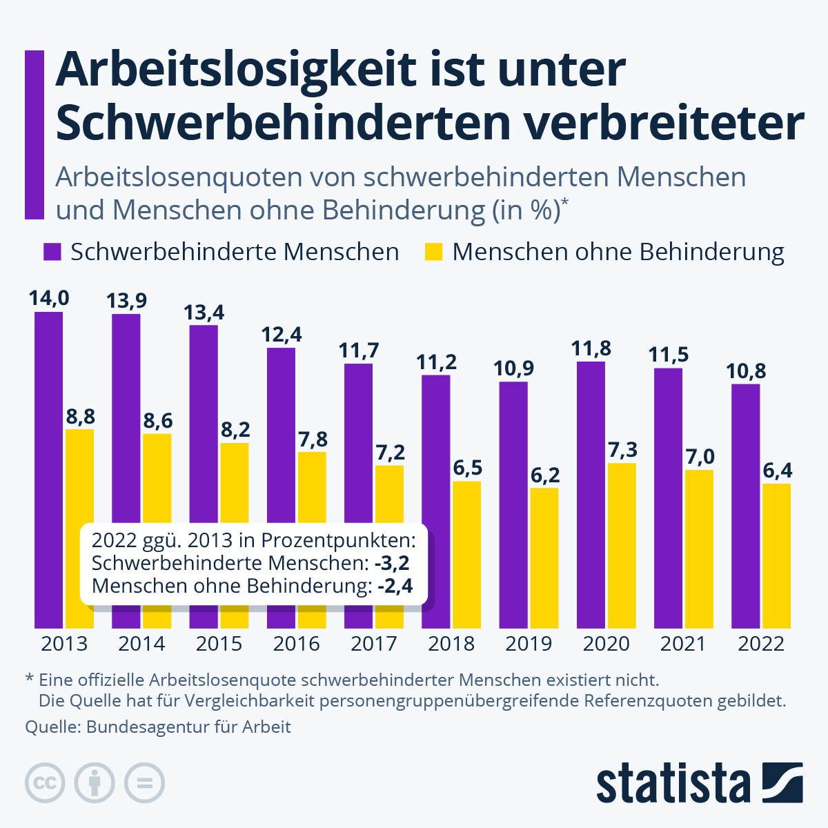 Für schwerbehinderte Menschen gestaltet sich die Teilhabe am Arbeitsmarkt schwieriger als für Menschen ohne Behinderung. Ein Indikator dafür ist die höhere Arbeitslosenquote von Schwerbehinderten. Sie lag im Jahr 2022 nach Zahlen der Bundesagentur für Arbeit bei rund elf Prozent. Bei Menschen ohne Behinderung lag die Quote dagegen bei 6,4 Prozent. Allerdings ist die Arbeitslosenquote Schwerbehinderter im gezeigten Zehnjahreszeitraum stärker zurückgegangen (-3,2 Prozentpunkte) als die Quote von Menschen ohne Behinderung (-2,4 Prozent).