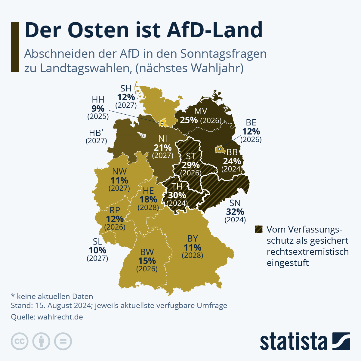„An der rechtsextremistischen Ausrichtung der AfD Sachsen bestehen keine Zweifel mehr“, so Dirk-Martin Christian Präsident des sächsischen Verfassungsschutzes Anfang Dezember 2023. Zu diesem Schluss sind zuvor schon die jeweiligen Verfassungsschutzlandesämter in Sachsen-Anhalt und Thüringen gekommen. Trotzdem sind es genau diese Bundesländer, in denen die Partei wahlrecht.de zufolge mit etwa 30 Prozent der Wähler:innen-Stimmen rechnen kann. Auch in Mecklenburg-Vorpommern und Brandenburg die AfD mit jeweils deutlich über 20 Prozent stärkste Partei. Indes schneidet die AfD auch im Westen der Republik, besonders in Niedersachsen und Hessen, bei Sonntagsfragen stark ab, wie der Blick auf die Statista-Grafik zeigt. Den schlechtesten Wert erreicht sie dagegen mit neun Prozent derzeit in Hamburg.