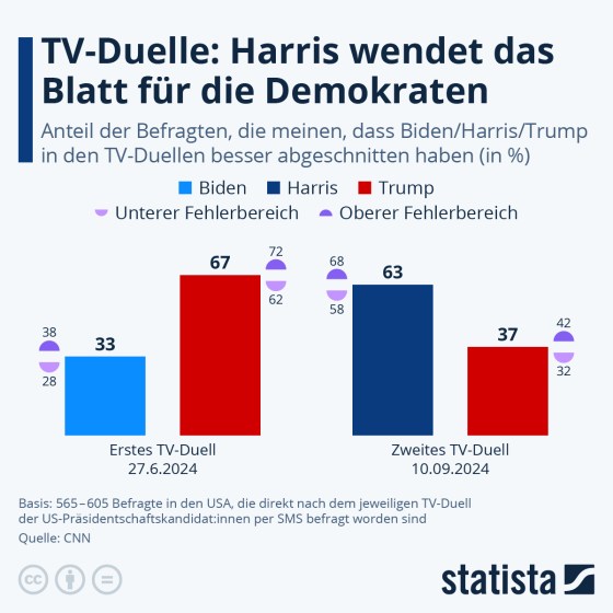 TV-Duelle: Harris wendet das Blatt für die Demokraten (Statista + Kommentar)+++ Harris und Walz sichern ihren Vorsprung