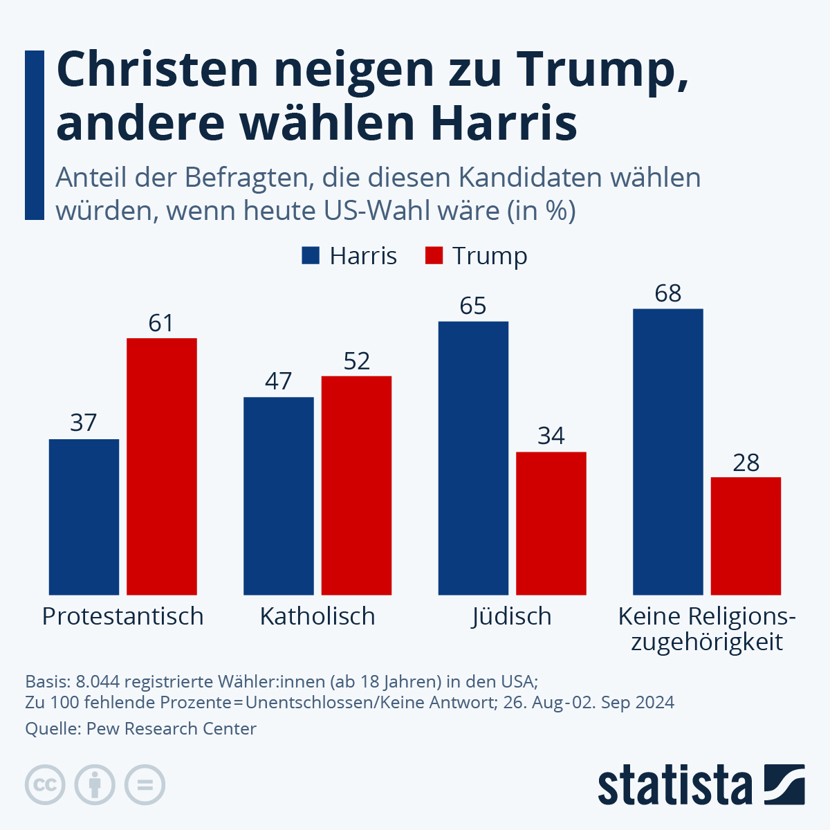 Bei der US-Präsidentschaftswahl geht es oft weniger um harte Fakten als um Glaubensfragen, wie eine aktuelle Umfrage des Pew Research Centers unter rund 8.000 registrierten Wähler:innen in den USA nahelegt. Demnach beantworten protestantische Christ:innen die Frage, wen Jesus wählen würde, für sich zu 61 Prozent mit Donald Trump. Es sei denn es handelt sich um schwarze Protestant:innen – in dieser Gruppe sind 86 Prozent Pro-Harris. Auch im katholischen Lager liegt der Republikaner vorne, wie der Blick auf die Statista-Grafik zeigt. Eine Ausnahme bilden hier Latinos, die zu 65 Prozent der aktuellen Vizepräsidentin zugeneigt sind. Das lässt sich auch über jüdische Wähler:innen sagen. Und wer gar nicht religiös ist, wird ebenfalls eher demokratisch wählen – das gilt ganz besonders für Atheisten (85 Prozent) und Agnostiker (78 Prozent,)
