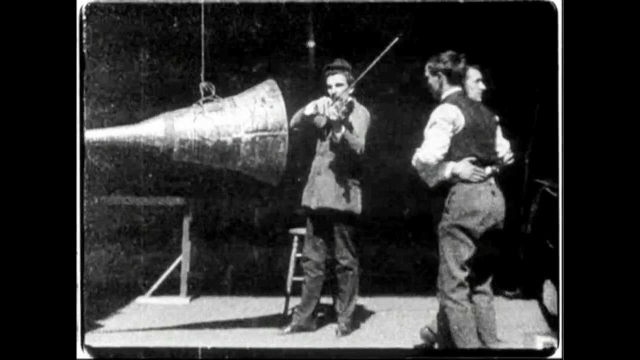 Man kann den Film auch so sehen: Die erste Männer-Tanzfilmszene der Welt, ich meine, es ist ein Walzer, wird mit der passenden Musik unterlegt, wir haben also einen echten Score. Und zu allem Überfluss wird er auch noch live eingespielt, wobei man den riesigen Aufnahmetrichter sieht, der damals notwendig war, um die ebenfalls noch ganz neuen Plattenspieler mit Musik zu versorgen. Wie auch das Abspielen, wofür frühe Grammophone ebenfalls große Trichter hatten, waren die Aufnahmen noch nicht elektrisch, sondern akustisch – bis Mitte der 1920er, als die elektrische Aufzeichnung erstmals so etwas wie hörbare Bässe ermöglichte und auch die Höhen besser hervorbrachte. Im Jahr 1893 konnte man froh sein, dass man überhaupt erkennen konnte, dass es sich hier um ein Gefiedel oder Geigengekratze handelt.