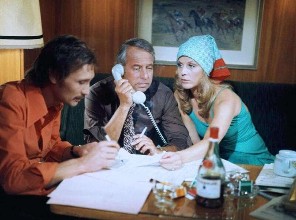 Tom: Schon möglich, dass die Ermittler absichtlich besonders gruselig angezogen wurden. Ironie dürfte dem Film wohl nicht fremd sein, denn die Art, wie die Schlagermenschen gezeigt werden, hat ganz sicher eine satirische Ausrichtung. Und es gibt echt witzige Szenen, wie die kleine Elektroorgel-Explosion, bei der Heidi Brühl nach hinten wegfliegt. Gottseidank ist ihr nichts Schlimmeres passiert. Ich glaube aber, jetzt gründlich nachzuforschen, ob es in der Schlagerwelt wirklich so zugeht oder von mir aus zu Beginn der 1970er so zuging, wäre zu viel des Guten. Ob der Fall, dass jemand die Musik für jemand anderen schreibt, weil dieser ihn erpresst, einem realen Tatbestand nachempfunden wurde? Vermutlich nicht direkt, davon wüsste man heute noch etwas.