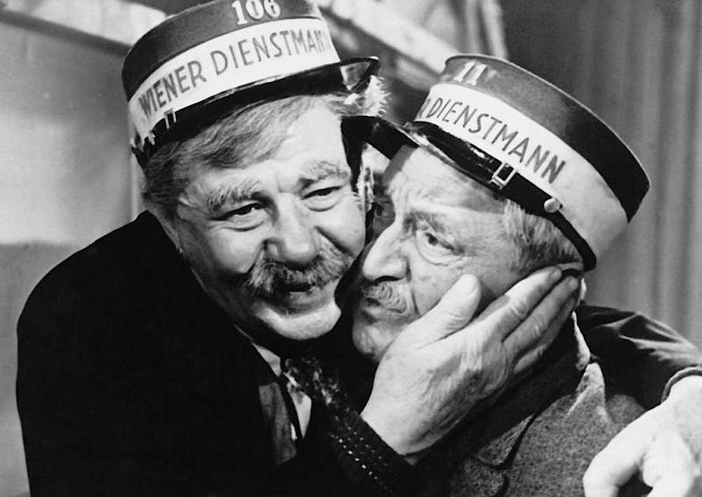 Da gibt es eine, heute schon klassische Szene, in der Moser und ich den verzweifelten Versuch unternehmen, einen scheinbar tonnenschweren Koffer die Stiegen hinaufzuschleppen. Ich sage laut Drehbuch: »Geh, sag, wo is denn a so a schwerer Koffer besser zum Tragen – vorn oder hinten?« Darauf Fachmann Moser, in gewohnt grantigem Tonfall: »Na, hinten natürlich, da is er ja leichter.« Und während die Kamera läuft, fällt mir das Extempore ein: »Na, weißt was, Kollege, dann nehm ma ihn doch beide hinten.« Der Hans hat daraufhin furchtbar lachen müssen, und wenn man den Film heute anschaut, sieht man noch genau, wie er an dieser Stelle das Lachen erfolglos zu unterdrücken versucht.