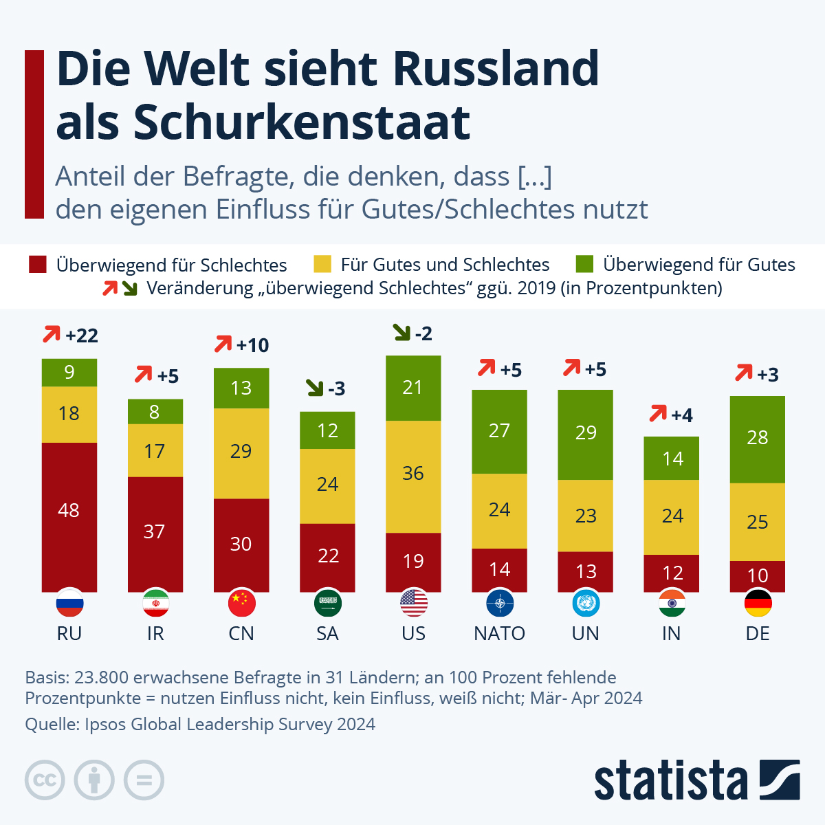 Russlands Präsident Putin empfängt heute die Vertreter:innen der sogenannten BRICS-Staaten in Kasan. Grund genug, einen Blick darauf zu werfen, wie die Weltgemeinschaft die Mitglieder dieser Staatengruppe sieht. Das Bild das sich dabei abzeichnet ist laut Ipsos Global Leadership Survey 2024 ein gemischtes. 48 Prozent der in 31 Ländern befragten 23.800 Erwachsenen sind der Meinung, dass Russland seinen Einfluss überwiegend für Schlechtes nutzt. Damit hat Putins Reich unter allen abgefragten Nationen den mit Abstand schlechtesten Ruf. Dabei galt das Land nicht immer als Schurkenstaat. Vor gerade einmal fünf Jahren hatten nur 26 Prozent der damals Befragten ein negatives Russland-Bild. Ebenfalls ein überwiegend schlechtes Images haben der Iran und China, wie der Blick auf die Statista-Grafik zeigt. vergleichsweise gut schneiden dagegen die BRICS-Mitglieder Saudi-Arabien und China ab. Und wie sieht es mit Deutschland aus? Zwar denken zehn Prozent, dass die Bundesrepublik ihren Einfluss überwiegend für Schlechtes nutzt, aber 28 Prozent sind gegenteiliger Meinung.