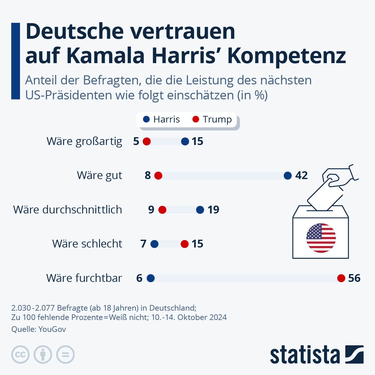Deswegen verbinden wir heute einmal die beiden Länder direkt miteinander, denn Statista hat eine Grafik dazu erstellt, wem von beiden Präsidentschaftsanwärter:innen die Deutschen auf welchem Gebiet mehr Kompetenz zurechnen und wie ihre Präferenzen sind. Das ist nicht gleichzusetzen mit einer hypothetischen Wahlentscheidung in Deutschland, wenn es hier Direktwahlen gäbe, um den Regierungschef oder die Regierungschefin zu bestimmen. Viele Menschen differenzieren durchaus zwischen dem, was sie hierzulande gut finden würden und dem, was gut für uns ist, wenn es um die US-Politik geht. Dieser vermutlich große Gap ist interessant und führt zu sehr eindeutigen Ergebnissen: