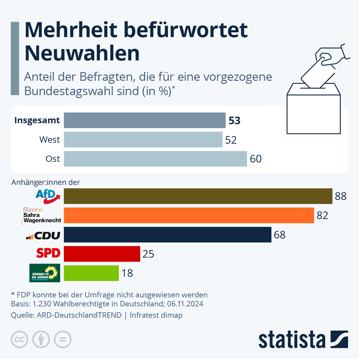 Nicht einmal einen Tag nach der Wahl von Donald Trump zum US-Präsidenten (wir haben teilweise live berichtet) scheitert in Deutschland die Ampelregierung. Auch bei uns wird es also bald zu Wahlen kommen. Wollen die Menschen das? Wir zeigen eine aktuelle Statista-Grafik zum Thema und haben natürlich die Infos zu den aktuellen Vorgängen etwas vertieft.
