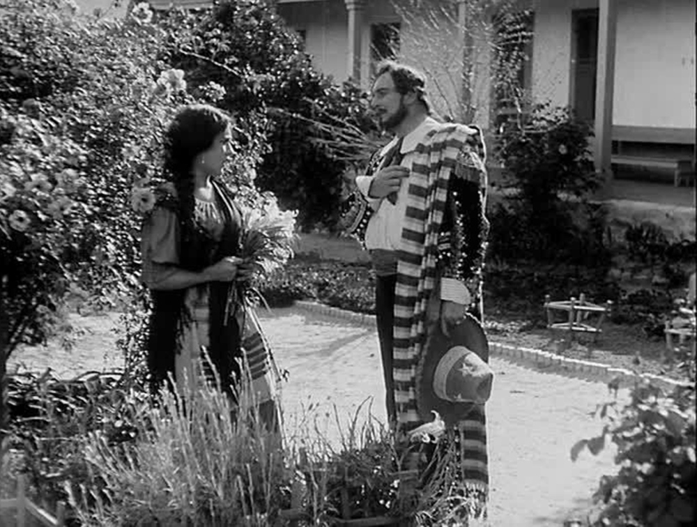 Die Kritiken von diesen Jungs lese ich auch gerne [5], weil sie das Ganze so abhandeln, dass es manchmal sogar dialektisch wirkt – in diesem Fall bezüglich der Tatsache, dass man keinen Schocker produziert hat, indem man Pickford wirklich eine Weiße hätte spielen lassen und nicht ein Mädchen, das denkt, sie sei Mexikanerin und ist in Wirklichkeit (auch) Native American. Über dies Stolperfalle konnte damals einfach kein Kinomacher springen: Es war, auch und spezifisch in Kalifornien, verboten, „Mischehen“ einzugehen, und das, soweit ich es im Kopf habe, bis in die 1940er Jahre. Wie hätte also ein Priester die Ehe zwischen der blonden Pickford und „Alessandro“, der natürlich auch von einem Weißen dargestellt wird, segnen sollen, so, wie man es im Film sieht? Immerhin sind sie beide christianisiert. Bei dem Mädchen wird das klar, bei dem Ureinwohner auf diese Weise beiläufig illustriert.