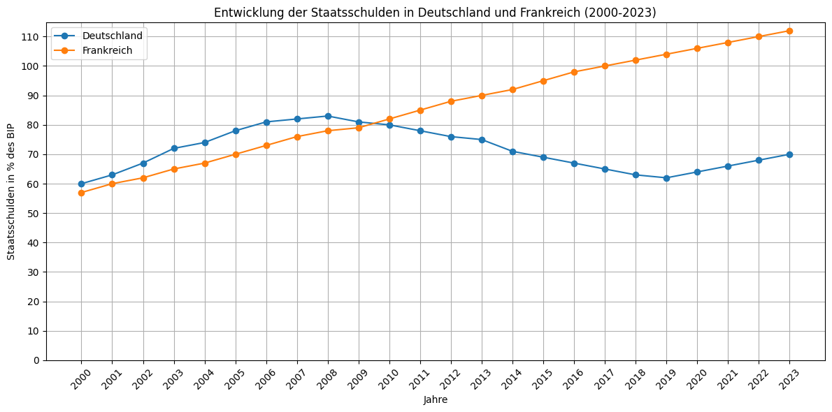 Das Diagramm zeigt deutlich, dass Frankreichs Schuldenquote kontinuierlich gestiegen ist, während Deutschland nach einem Anstieg in den frühen 2000er Jahren seine Schuldenquote reduzieren konnte.