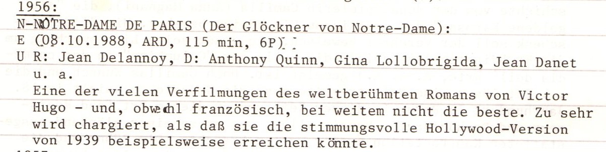 Als wir die Rezension schrieben, gab es noch keine IMDb, die wir hätten zum Vergleich heranziehen können, aber deren Publikum spricht eine deutliche Sprache: 6,6/10 für die Verfilmung von 1956 und 7,8/10 für die von 1939, obwohl der berühmte Jacques Prévert das Drehbuch mitverfasst hat, der für einige der besten Skripte für Filme des Poetischen Realismus verantwortlich ist. Aber die Ausführung zählt natürlich auch. Und ich erinnere mich, dass ich, obwohl ich Anthony Quinn als Schauspieler sehr mag, ihn für diese Rolle nicht perfekt fand oder seine Darstellung nicht perfekt, während Charles Laughton und Lon Chaney genau die Typen sind, die eine solche Figur so darstellen können, dass sie schrecklich und anrührend zugleich wirkt. Bei den Esmeraldas kommt für mich Maureen O’Hara besser weg als Gina Lollobrigida. Da ist der Abstand vielleicht sogar noch größer. Ob das dem Roman getreu ist oder nicht, die Dezenz und Anmut von O’Hara hat bei mir mehr Identifikation hervorgerufen.