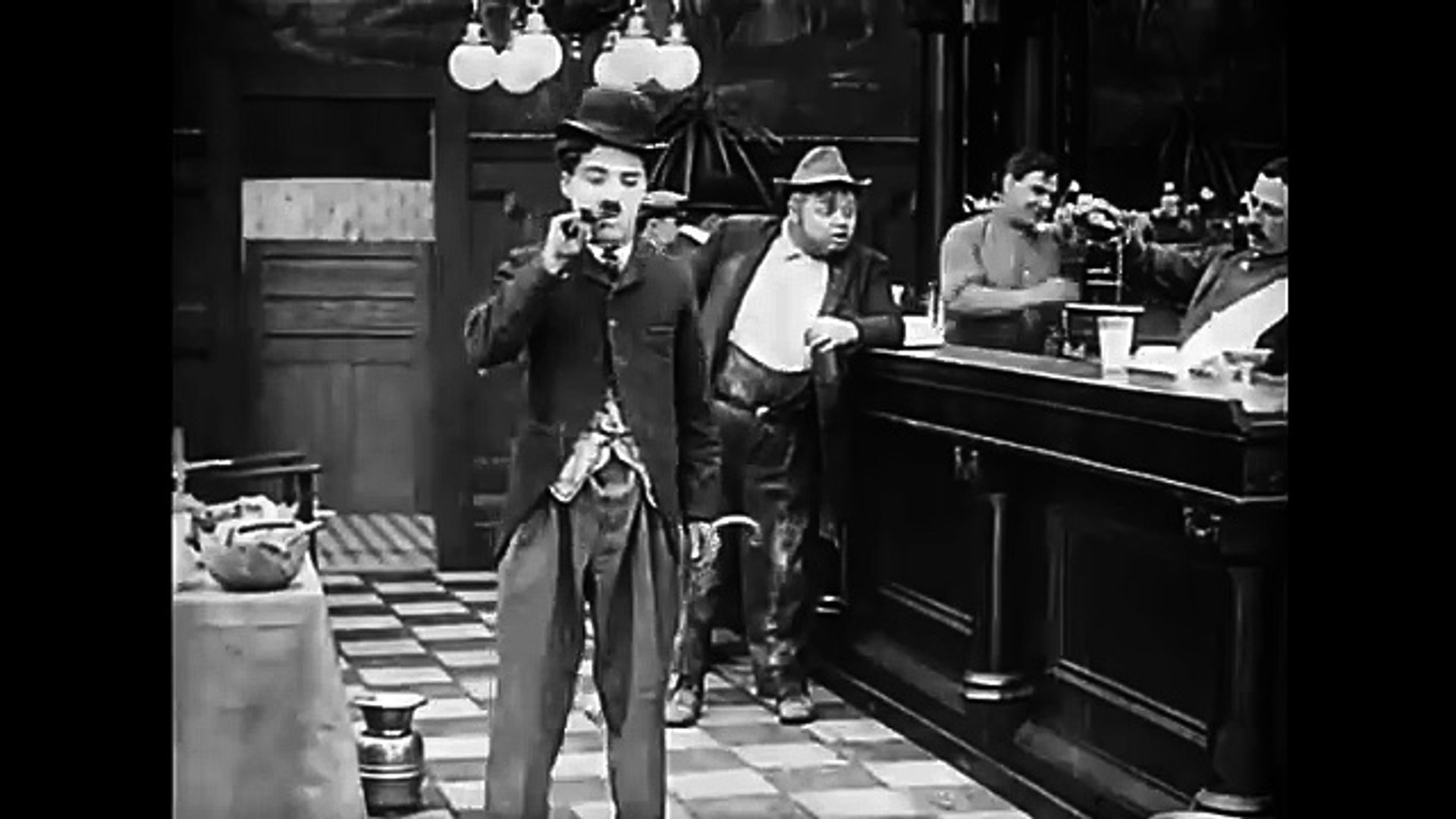 Diese Kritik bezieht sich beispielsweise auf den ersten Teil des Films und bestätigt damit indirekt meine Bewertung, dass dieser gelungener ist als der zweite, mit der Trennlinie nach der Straßenbahnszene, die durchaus noch etwas Actionreiches hat. Derlei kommt in US-Slapstick-Komödien aber dermaßen häufig vor, dass ich unmöglich sagen kann, ob Chaplin damit eine Innovation vollbracht hat. Jedenfalls ist die Szene tatsächlich im Fahren gefilmt, was 1914 noch recht ungewöhnlich gewesen sein dürfte, amerikanische Filme verwendeten bis in die Kino-Neuzeit hinein die Rückprojektion. Die Anfangsszene hingegen zeigt, dass man noch abgerissener sein kann als der Tramp, der hier eine soziale Mittelstellung im Barmilieu innehat. Er bestellt etwas für sich und die, nun ja, arme Sau, der Dreckspatz, den Roscoe Arbuckle darstellt, damals der größere Star im Vergleich zu Chaplin, wird vom Tramp verarscht, indem er ihn die Schaumkrone vom Bier blasen lässt, aber ihm nichts davon zu trinken gibt. Später kommt ein größerer, besser angezogener Barbesucher und springt seinerseits mit dem Tramp um.