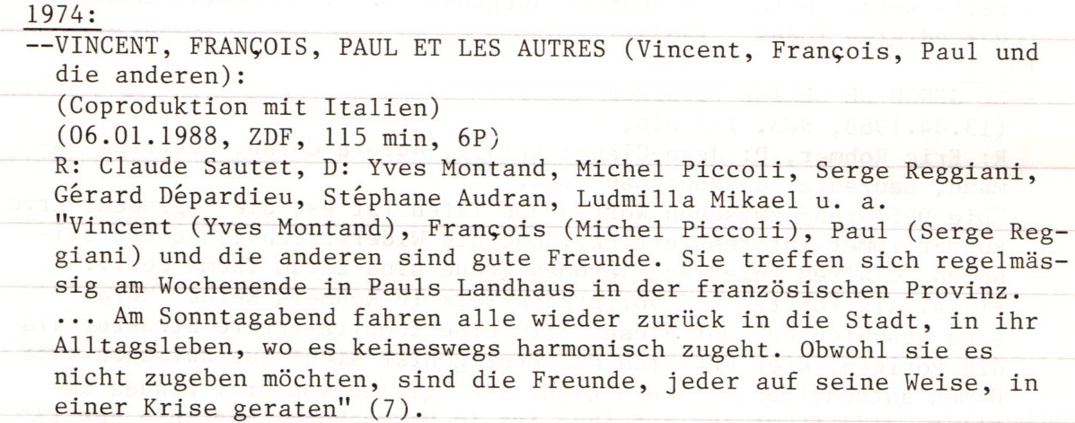 „Wir hatten am Ende der Rezension zu „Die Dinge des Lebens“ bereits angekündigt, dass wir bei Regisseur Claude Sautet bleiben, vier Jahre voranschreiten und mit „Vincent, Francois, Paul und die anderen“ ein weiteres Werk von ihn über Beziehungen vorstellen möchten. Wir möchten sogleich warnen. Dies ist ein Männerfilm. Sollten Frauen, dann sollte das nur zu Studienzwecken geschehen.“ So lautete unsere Einleitung zur Rezension am 15.11.2018, als das Werk auf dem Filmfest vorgestellt wurde. Heute ergänzen wir nur unseren kleinen Text aus dem Jahr 1989 und nehmen ein paar kleine Korrekturen an der Rezensionsversion von 2018 vor, inklusive Anpassung der Optik an die aktuelle Gestaltung der Rezensionen. Die Version von 2018 fußt wiederum auf dem Text, der 2011 als einer der ersten der damaligen FilmAnthologie im ersten Wahlberliner veröffentlicht wurde. Wenn man den im Anschluss gezeigten als Bild eingebetteten kleinen Beitrag von 1989 mitrechnet, haben wir uns bereits viermal mit dem Film befasst. Durch verschiedene Ergänzungen hat er jetzt auch den Status einer „DGR“ („Die große Rezension“) erreicht, was unserem Verhältnis zu diesem Film gerecht wird.