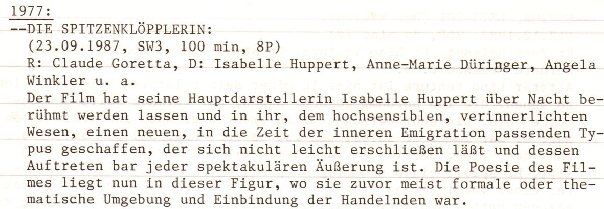 1989, als der obige Text verfasst wurde, war Isabelle Huppert noch beinahe ein Jungstar, heute ist sie eine der letzten „Grandes Dames“ des französischen Kinos und eine echte Spitzenschauspielerin, die sehr unterschiedliche Rollen beherrscht, wie auch ihre Theaterarbeit beweist. Dass sie im Film anders kann als in „Die Spitzenklöpplerin“, in dem ich sie wohl seinerzeit erstmals gesehen habe, zeigt sie unter anderem in „Biester“ von Claude Chabrol, der eines der bösesten Werke seiner quasi künstlerischen Wiedererweckung Ende der 1980er und in den 1990ern darstellt. Da wurde er, in diesem Fall mit Huppert und Sandrine Bonnaire, die den Film tragen, wieder so gut wie Anfang der 1970er und zeigt eine famose Altersradikalität. Selbstverständlich sind diese beiden Filme mittlerweile nicht mehr die einzigen mit Huppert, die ich gesehen habe, aber den Chabrol fand ich besonders prägnant und kennzeichnend für Hupperts Bandbreite in Relation zu einem „Frühwerk“ von ihr wie „Die Spitzenklöpplerin“.