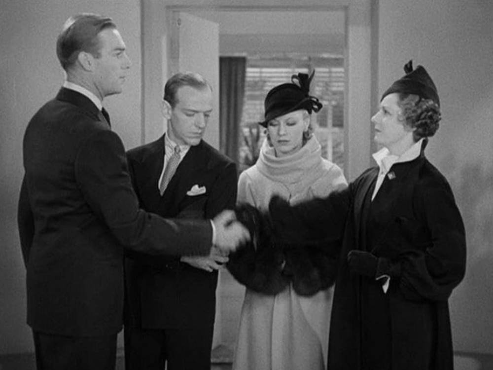 Ein bisschen überdramatisiert wirkt die plötzliche Liebe zu diesem Schrank namens John durchaus, und dann wird, sehr selten in einem Musical, gezeigt, wie eine Person stirbt, die von der Prinzessin zuvor noch in den Schlaf, mithin den ewigen Schlaf, gesungen wurde. Ich kann mir gut vorstellen, warum man Irene Dunne gerne als neue Garbo aufgebaut hätte und ihr Rollen wie Mrs. Miniver angeboten hat, während bei der eher kumpelhaft wirkenden Ginger Rogers noch nicht abzusehen ist, dass sie fünf Jahre später den Oscar für eine dramatische Rolle in dem Film „Kitty Foyle“ erhalten würde, der in den bisherigen Karrieren der beiden eher typisch für Dunne gewesen wäre. Diese wurde fünf Mal für den Oscar nominiert, gewann ihn aber nicht. Mit ihrem Sieg stach Rogers auch ihren bisherigen Filmpartner Fred Astaire aus, der nie einen Schauspieloscar erhielt (wohl aber 1950 einer der ersten Ehren-Oscar-Gewinner war, also noch während seiner aktiven Zeit). Nicht ganz so berühmt wie viele andere Nummern der beiden ist, was man an Tänzen von Astaire und Rogers zu sehen bekommt. Gleichwohl sind besonders Astaires Solonummern, so kurz sie hier sein müssen, erstklassig.