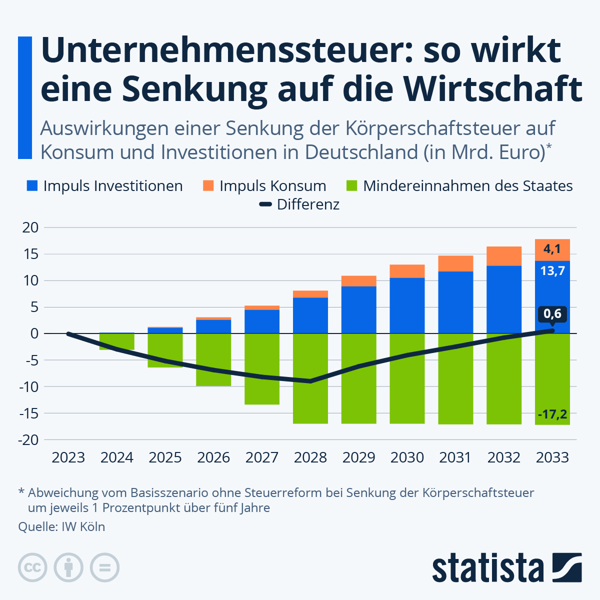 Wie die Statista-Infografik allerdings weiterhin zeigt, nimmt die negative Differenz im Zeitverlauf deutlich ab. Laut IW Köln verringert sich das Defizit zwischen positiven Wachstumsimpulsen und den entstandenen Mindereinnahmen des Staates ab dem fünften Jahr spürbar. Läge die Differenz im Jahr 2028 noch bei -8,9 Mrd. Euro, betrüge sie 2032 nur noch 800 Mio. Euro. Im Jahr 2033 würde sich der Berechnung zufolge der Saldo umkehren: Die Mindereinnahmen des Staates wären dann geringer als das Plus bei Konsum und Investitionen.