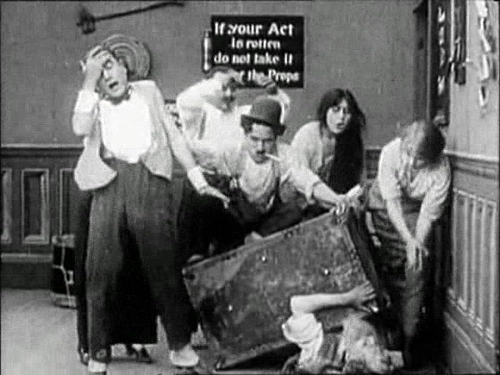 „The Mumming Birds“2, das in den USA als „A Night in an English Music Hall“ angekündigt wird, ist eine aufwendige Meta-Produktion, in der Mitglieder des Publikums eine Reihe von absichtlich grausamen Auftritten stören. Für Karno spielte Chaplin einen betrunkenen Upper-Class-Trottel, der auf die Bühne stolpert, um entweder die Showgirls zu bestaunen oder die lahmen Acts hinter der Bühne zu verprügeln. In The Property Man nimmt uns Chaplin mit hinter die Bühne, wo er abwechselnd von den glamourösen Goo-Goo-Schwestern (Cecile Arnold und Vivian Edwards), Garlico dem starken Mann und seiner Assistentin/Ehefrau (Jess Dandy und Helen Carruthers) und einem Shakespeare-Paar, Lena Ham und George Fat (Phyllis Allen und Charles Bennett), belästigt wird und belästigt wird.