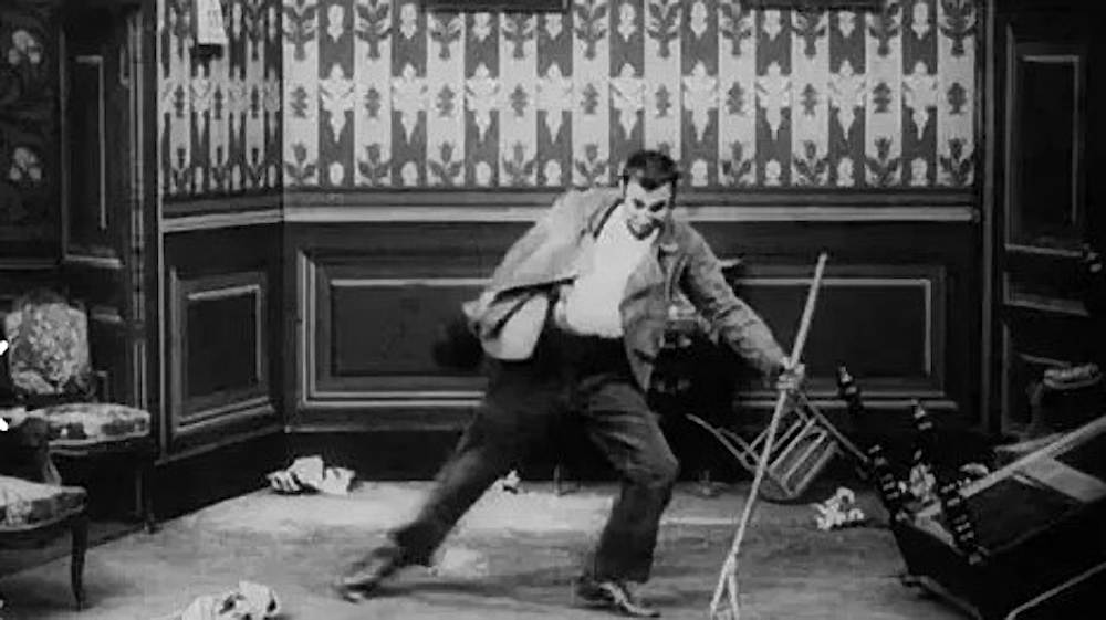 Wir werden noch mehrere Filme von Alice Guy sichten, aber ich war in der Tat über die Art des Slapsticks erstaunt, der sehr „männlich“ wirkt und auch nur Männer in aktiven Rollen zeigt. Vor allem natürlich den Schuhputzer, der dafür sorgt, dass es Durchbrüche durch gleich zwei Stockwerke gibt. Wenn Sie in einem Altbau wohnen, können Sie sich vielleicht vorstellen, wie der Mann so lange die Dielen abschrubbt, bis sie durch sind. Im Normalfall würde jemand, der durch das dadurch entstandene Loch fällt, nicht durch ein weiteres Stockwerk purzeln, auch nicht bei Dielenböden der Zeit um 1900, aber es ist ein Slapstick, und für ihn gelten manche Gesetze der Physik nicht. Glücklicherweise, denn wir hätten unzählige wunderbar witzige Filme niemals zu sehen bekommen, wenn man diese Gesetze darin ernstgenommen hätte.