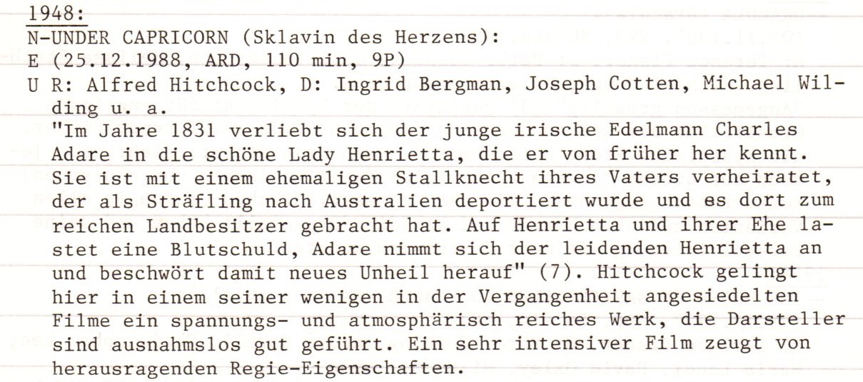 Seinerzeit war ich von „Under Capricorn“ ziemlich beeindruckt und fand den außergewöhnlichen Touch des Films nicht irritierend, reihe mich also eher in die kritischen Stimmen aus Europa ein, die darin etwas Besonderes entdeckt haben. Bergman ging nach „Under Capricorn“ nach Europa und konnte erst 1956 in den USA wieder erfolgreich filmen. Und wie wäre der Film mit Burt Lancaster anstelle von Joseph Cotten geworden? Ganz anders, nach meiner Ansicht, die beiden Schauspieler sind als Typen beinahe Antipoden. Leider hat Hitchcock auch später nie mit Lancaster gefilmt, sondern in seiner erfolgreichsten Zeit überwiegend mit den Stars, mit denen er in den 1940ern anfing, Arbeitsbeziehungen aufzubauen: Cary Grant und James Stewart.