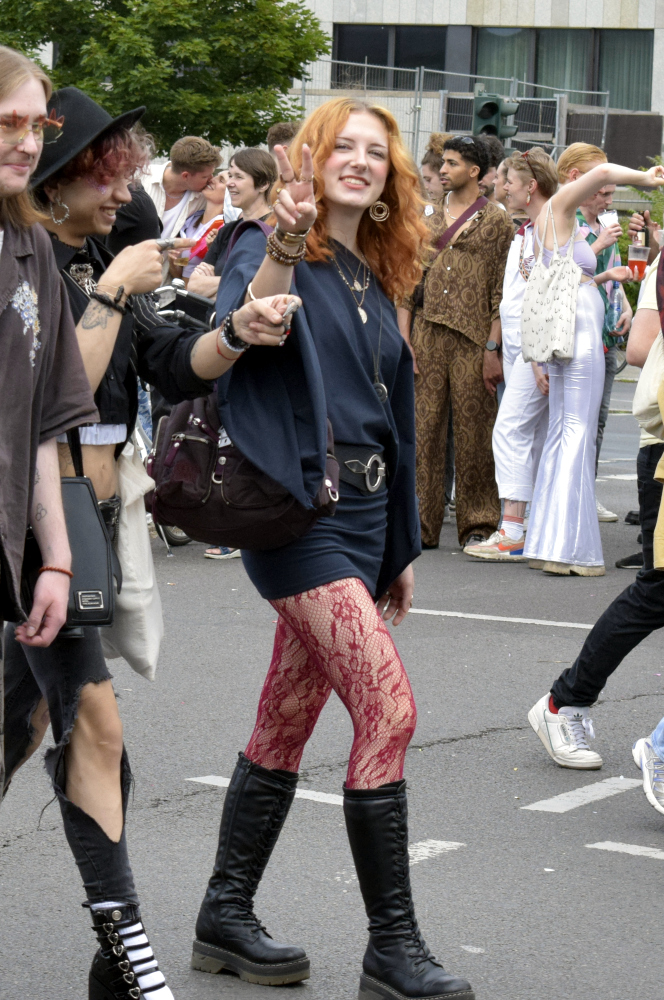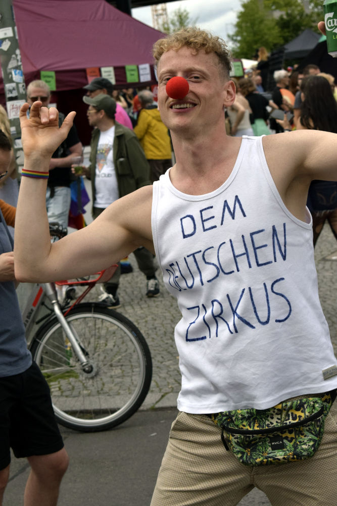 Der CSD ist eine politische Demonstration und als solche angemeldet, auch wenn bekannte Politiker versuchen, die LGBTQIA*-Bewegung als eine Art Zirkus zu diffamieren. Dieser Angriff auf die Bewegung wurde auf dem Zug vielfach thematisiert, meist mit der Ironie, die sich die LGBTQIA*-Menschen im Laufe von Jahrhunderten der Entrechtung und Verfolgung angewöhnt haben. Diese Ironie ist nach unserer Ansicht ein wenig dem „jüdischen Witz“ ähnlich, und auch die Geschichte der beiden Gruppen weist Parallelen auf. Auf den Fotos wird man an einer Stelle auch eine Form der Solidarität sehen. Diese Art von Humor hat etwas mit Untergrund zu tun, mit Diaspora, mit dem Ausharren außerhalb der „Mainstream-Gesellschaft“ fast ohne Hoffnung.